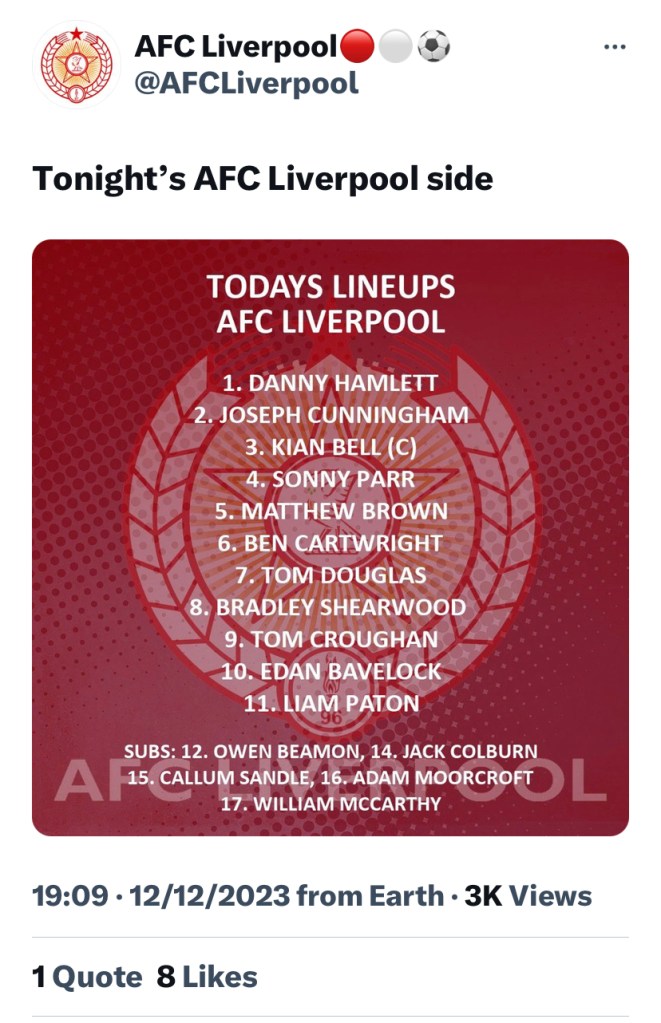After that the game petered out and the away sides numerical advantage proved to be to much for AFC Liverpool and the last 15 mins was very comfortable to say the least.